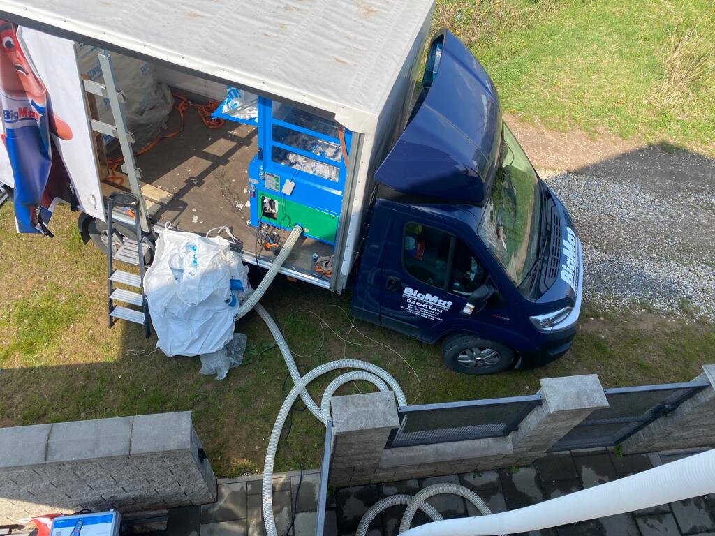 Celoročne obývaná chata, doplnenie chýbajúcej izolácie v medzikrokvovom priestore v hrúbke 150mm a zaizolovanie stropu najvyššieho podlažia v hrúbke 400mm. Trvanie realizácie – 1,5 hodiny, zákazník nemal dostupnú elektriku na 380V, ktorú potrebujeme na fungovanie stroja, bola použitá zapožičaná elektrocentrála.